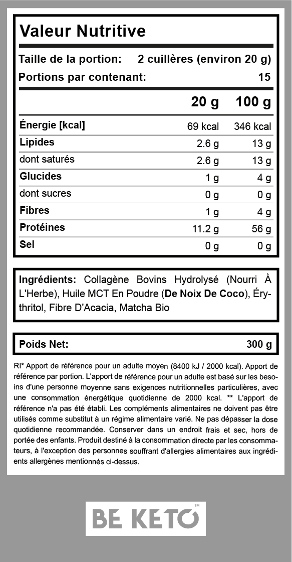 Vous aimez le goût du matcha ? Si c’est le cas, alors BeKeto™ Collagène + MCT est fait pour vous ! Il est fabriqué à partir de collagène de bœuf biologique de type I (nourri à l’herbe), qui constitue 90 % des protéines de collagène et est essentiel à l’organisme en tant que composant majeur de la peau, des ligaments et en apportant de la force aux tissus conjonctifs. Il s’agit d’une combinaison de protéines et de graisses facilement digestibles et bien absorbées. Cette combinaison de peptides de collagène et de triglycérides à chaîne moyenne (MCT) vous offre la source de protéines et de graisses la plus saine qui soit. Une bonne supplémentation en collagène est essentielle pour soutenir votre santé et votre bien-être.