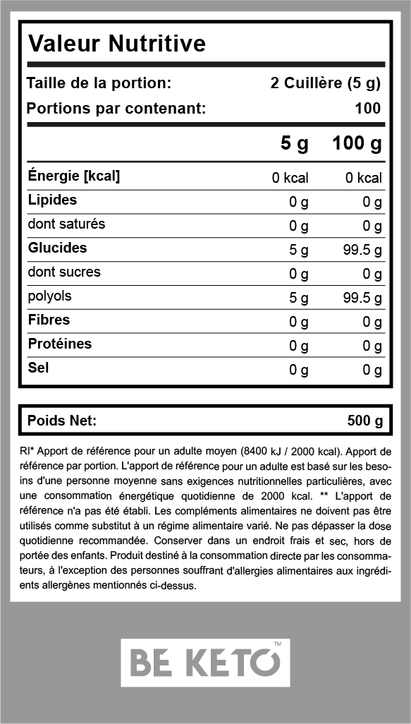 Il existe de nombreux substituts au sucre, mais dans le cadre du régime faible en glucides et cétogène, l'érythritol est le numéro 1 selon nos recherches. Il ne contient aucune calorie et n'est absolument pas absorbable par l'organisme, ce qui fait que sa teneur nette en glucides est également de 0. Il peut être utilisé sans crainte de précipiter un état de cétose. C'est, entre autres, la raison pour laquelle nous l'utilisons dans de nombreux produits BeKeto™ tels que les chocolats Keto, les crèmes Keto et les barres Keto.