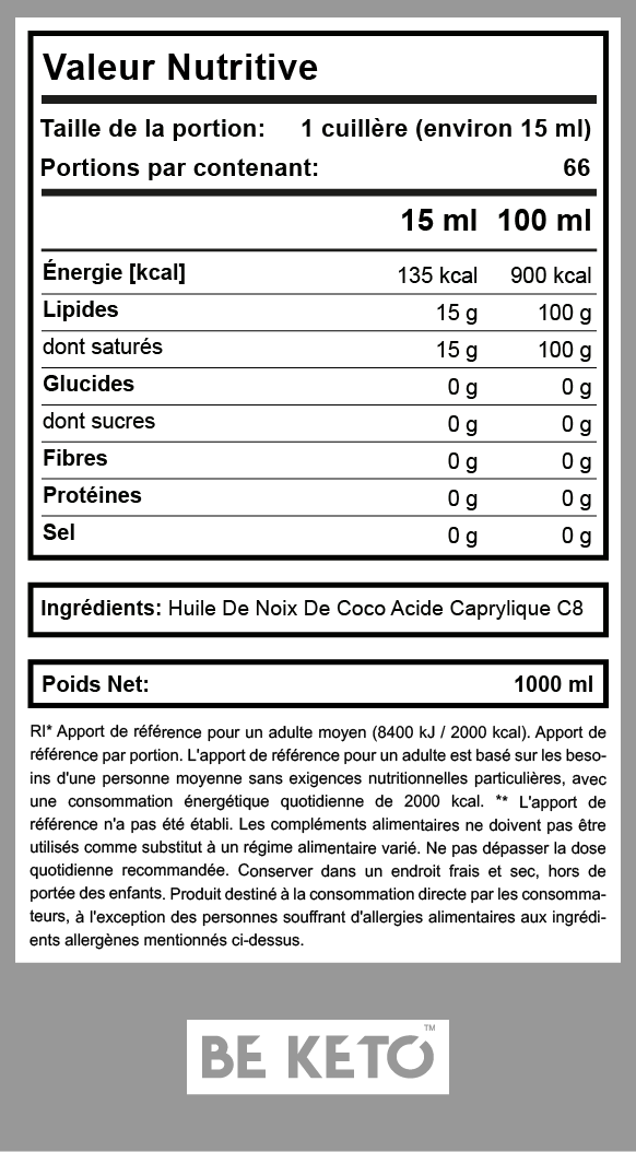 Saviez-vous que l'huile MCT C8 est le type le plus parfait de triglycérides à chaîne moyenne en raison de ses chaînes les plus courtes et de sa biodisponibilité élevée ? L'huile MCT C8 vous procure une poussée immédiate d'énergie stable. L'huile MCT C8 de BeKeto™ est composée à 100 % d'acide caprylique. Elle est fabriquée en Allemagne selon les normes de production les plus strictes. Les noix de coco à partir desquelles nous produisons nos MCT proviennent de l'agriculture biologique. MCT Pure C8 de BeKeto™ - numéro un dans le monde.