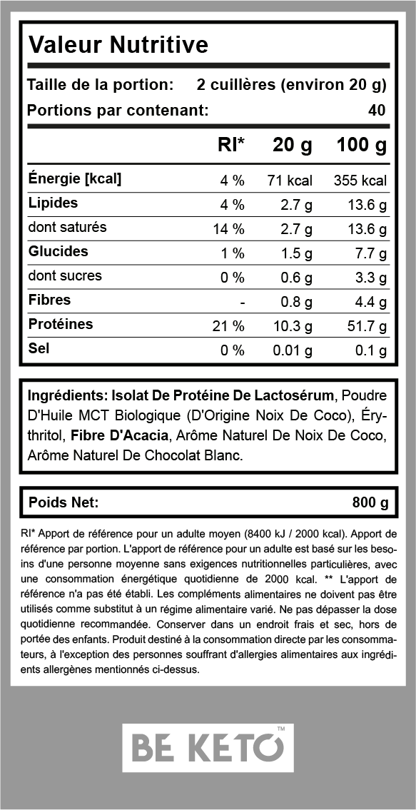 Isolat de Whey Keto + Huile MCT – Noix de Coco & Chocolat Blanc 800g
