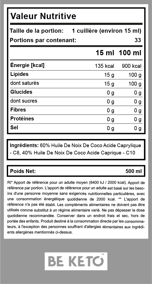 ✔ Contient des acides gras à chaîne moyenne C8 et C10
