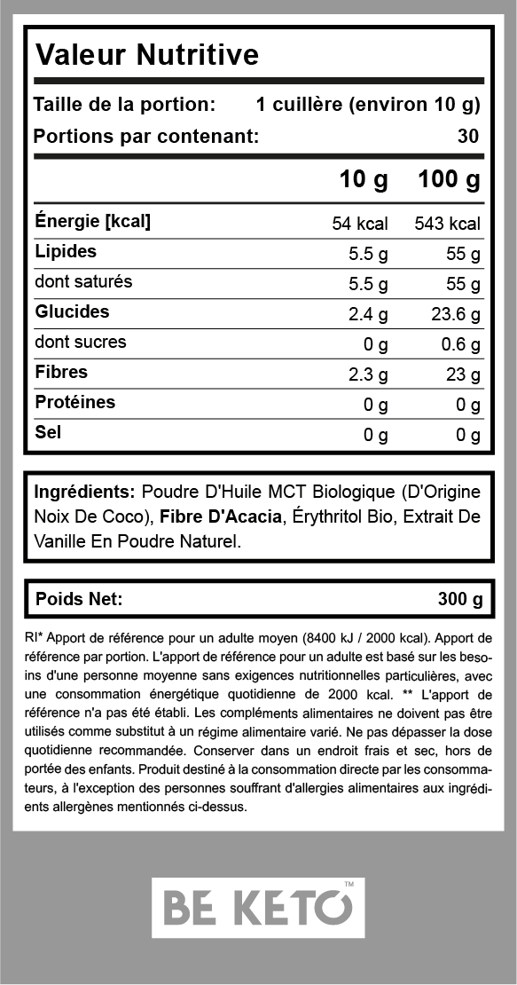 Nous avons ajouté une dose saine de fibres d'acacia qui guérissent les intestins et restons à l'écart de tout édulcorant. Notre poudre d'huile MCT BeKeto™ est la poudre de la plus haute qualité sur le marché, sans problèmes digestifs ou gastro-intestinaux.