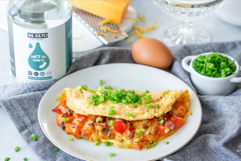 Omelette Keto – nous vous proposons la recette d’une omelette délicieuse et rapide ! Une recette polyvalente que vous pouvez personnaliser avec les ingrédients que vous aimez. Ajoutez votre fromage préféré et remplacez le bacon par du jambon ou de la saucisse de bonne qualité. Une omelette pour le petit-déjeuner avec de l’huile MCT C8 ou C8+C10 est un excellent repas qui vous donnera un regain d’énergie constant pour toute la journée !